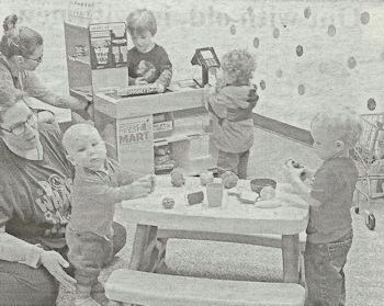 reading books. A mini shopping center/cashier area allows kids to select toy