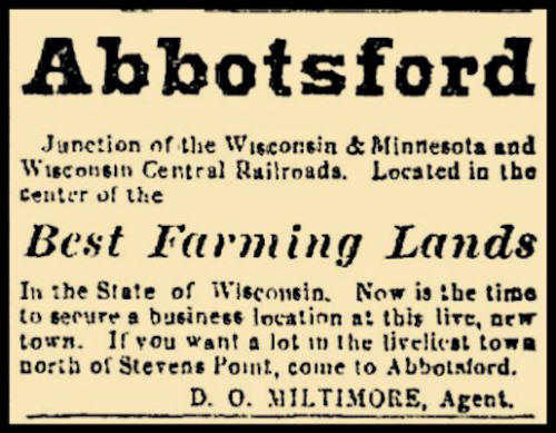 Junction of the Wisconsin & Minnesota and Wisconsin Central Railroads. Located in the center of the Best Farming Lands in the state of Wisconsin. Now is the time to secure a business location at this live, new town. If you want a lot in the liveliest town north of Stevens Point, come to Abbotsford.