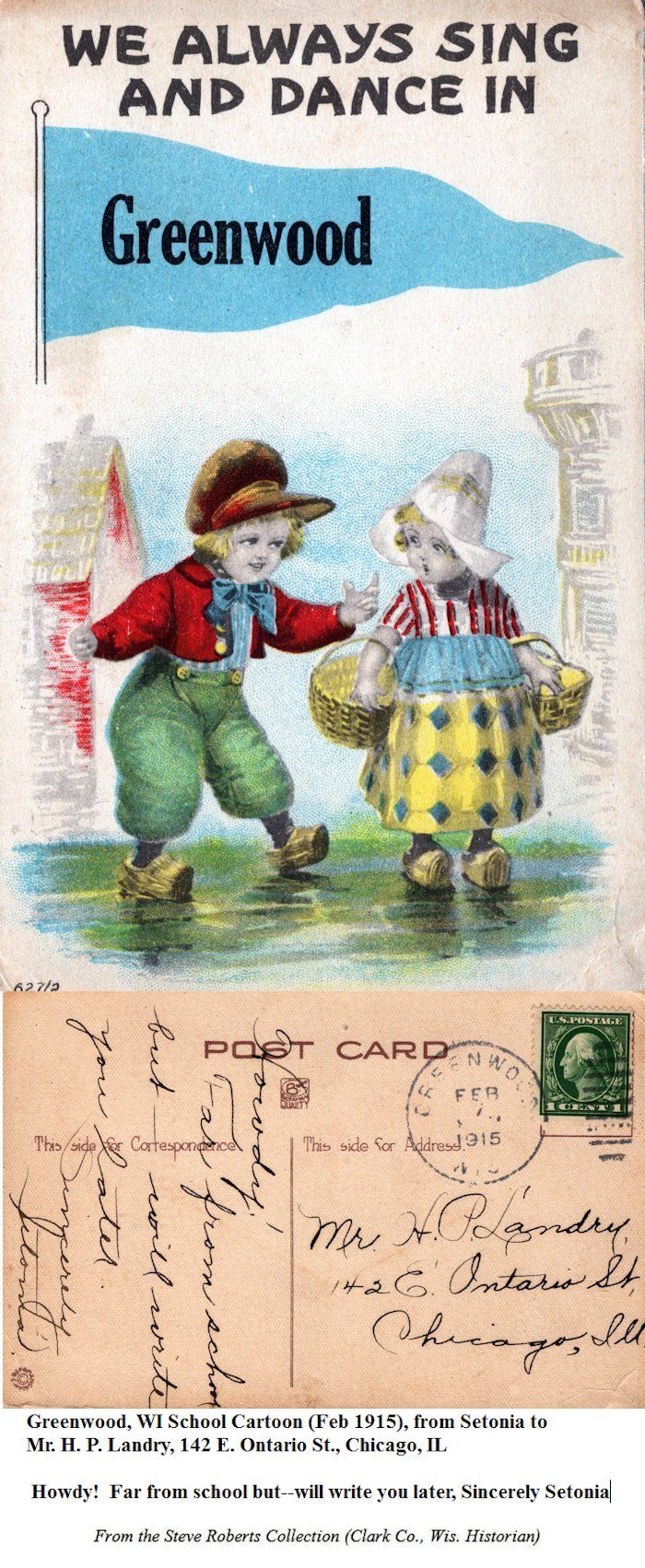 Setonia Braun of Greenwood, WI sent a postcard to Mr. Howard P. Landry, 142 E. Ontario St., Chicago, IL (Feb 1915).