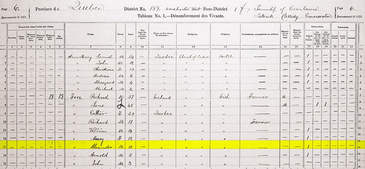 Arnold Free Male 15 1866 Quebec Son Irish Irish Church of England Cranbourne