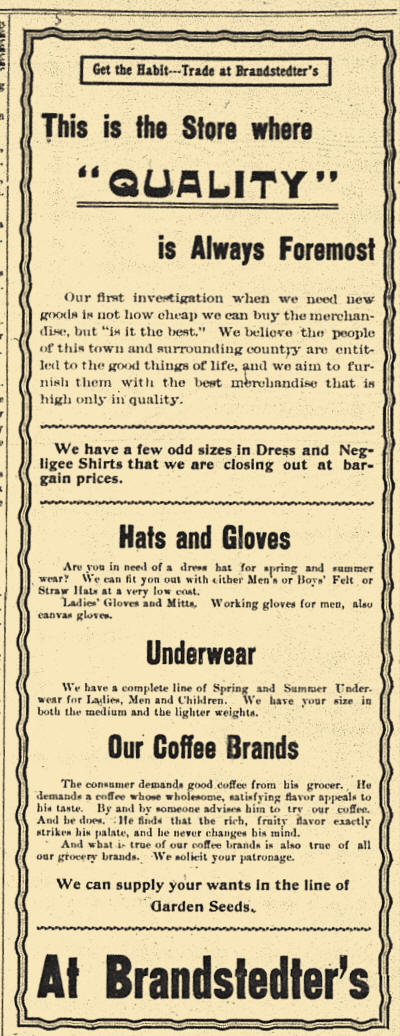 Charles Brandstedter, at the the age of 18 years, left the farm and went to work on the Huntzinger farm for three years. He then went to Fairchild, where he obtained a position as clerk in the store of M. Pedrick, but after remaining with him a short time, took up farm work again. He was also employed in the furniture factory at Neillsville for seven years. Then he again entered mercantile business, working in various stores until 1901, in which year he bought out G. W. Crandell, of Humbird, and has since conducted his present business on a profitable basis. He is also a stockholder in the Central Wisconsin Telephone Company and the Wisconsin Light and Power Company.