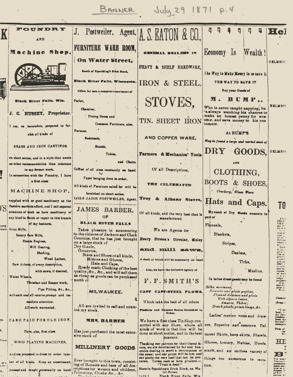 Black River Falls, opening a tin and hardware shop, where he