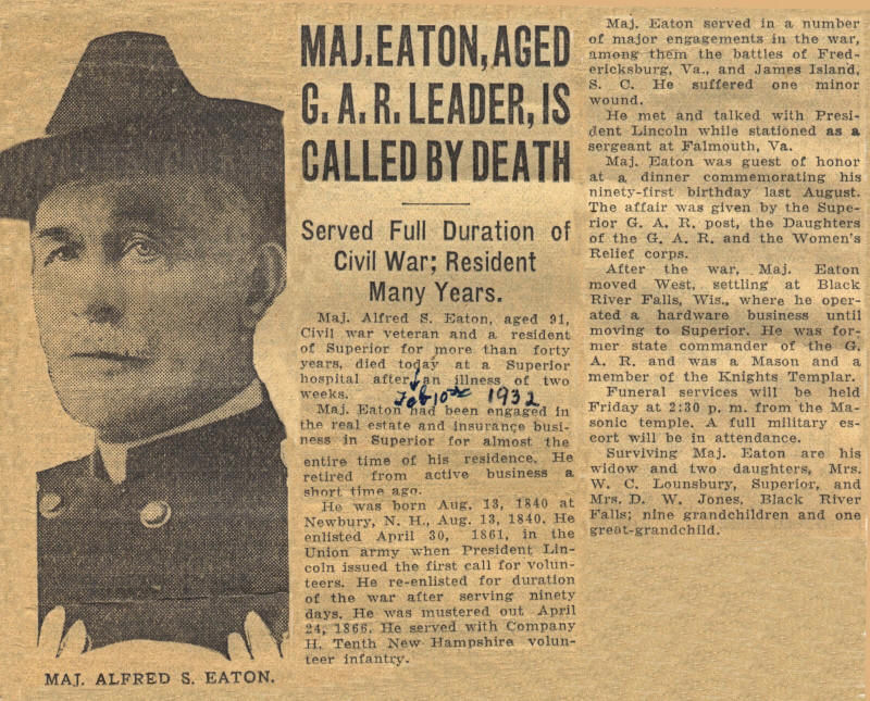 Major Eaton died in Superior, Douglas County, Wisconsin, February 10, 1932. He and Emeline are both buried in the Greenwood Cemetery, Superior, Douglas Co., Wis.