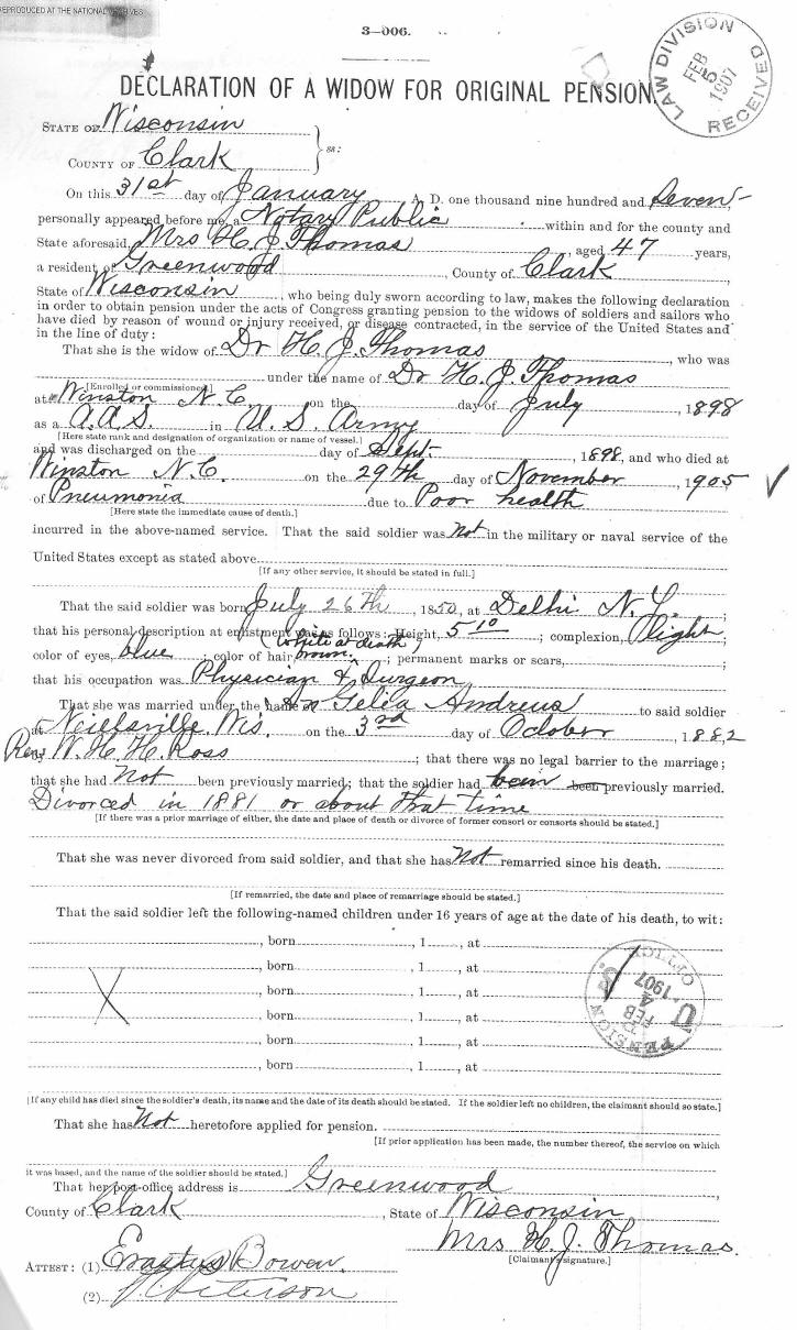 Dr. Thomas and his little family resided in Greenwood, Wisconsin for 17 or 18 years. Then, in about 1891 they moved to Winston-Salem, North Carolina where Dr. Thomas lived for fourteen years before his surprisingly early death at age fifty-five. Dr. Thomas was an honored Mason, being a member of Winston lodge No. 167 and of Piedmont Commandery, RAM, No. 24. In his obituary notice, The Twin-City Daily Sentinel, Winston-Salem, N. C. said; "For fourteen years Dr. Thomas has been a resident of Winston-Salem and during that time he had built up a lucrative practice, and greatly endured himself to hundreds of our people. Well qualified in his chosen profession, with a kind and sympathetic heart, a jovial nature, he had won a warm spot in the hearts of all who knew him. In the death of Dr. H. J. Thomas the Twin-City loses one of its most popular and most highly esteemed citizens. Since his death the expression has been frequently heard, "I never heard him speak aught against any man. Dr. Thomas was exceedingly popular with the poorer people of the city, for many of whom he performed acts of real benevolence. To them he was a friend in need. The funeral service was conducted from the home with Knights Templar honors at three o'clock Wednesday (Nov. 30, 1905). The interment was made in the Masonic plat in the Salem cemetery and afterward, Gelia returned to Greenwood, Wisconsin to be comforted by her family.