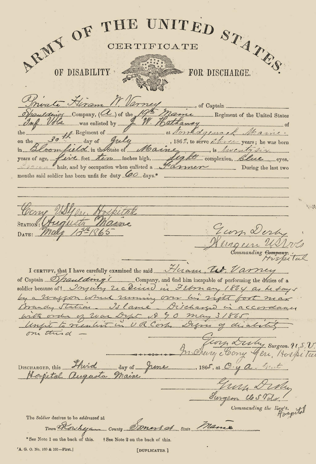 Hiram was born 23 June 1836 in Skowhegan, Somerset, ME, the son of Levi and Harriet (Stewart) Varney.