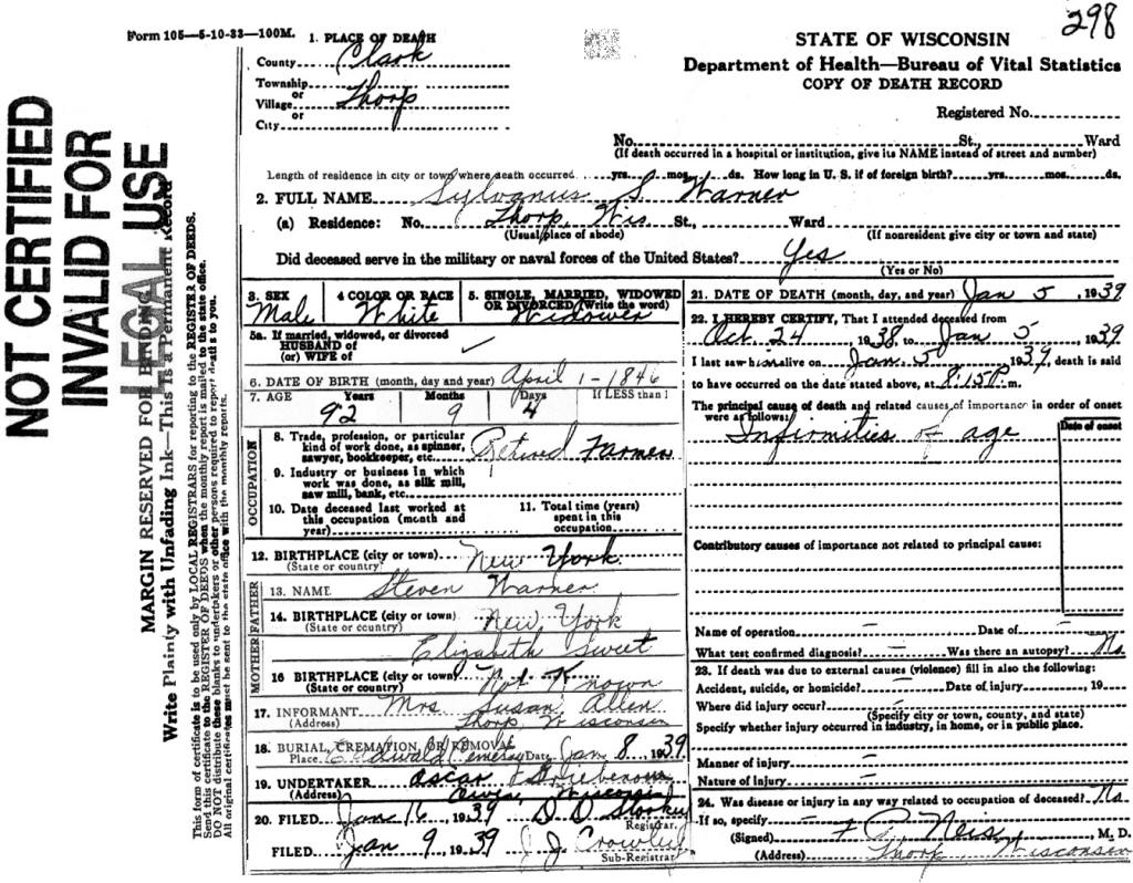 (Sweet) Warner. The father, a farmer by occupation, was a native of