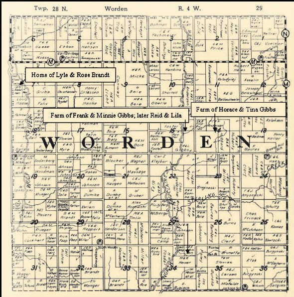 It was in 1906 that Horace W. and Francis H. (Frank) Gibbs came from the Plainfield/Packwaukee area of Wisconsin and settled in the Town of Worden in Clark County. After their marriages, Frank’s children, Beth and Reid, also settled in the Town of Worden, Beth in South Worden and Reid on the home place near Thorp. Beth’s son Lyle Brandt and Reid’s son Lloyd also farmed there and were active in school affairs and in the government of the township.