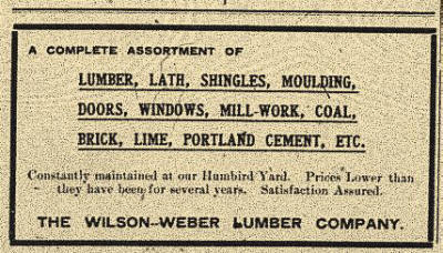 | The Wilson-Weber Lumber ad above appeared in The Humbird Enterprise, Humbird Wis., pg. 1, 23 May 1908 |