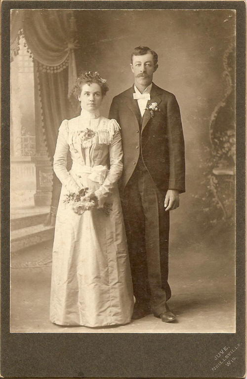 A very pretty wedding took place at noon Wednesday at the residence of Mr. and Mrs. Geo. W. Smith on the North Side (Neillsville, Clark County), at which their daughter Mary and Mr. Wm. J. Nutting were united in marriage, Rev. E. A. McKinney, of Marshfield, officiating. About seventy-five invited guests were present. The rooms were beautifully decorated with evergreens and flowers, the principal floral decoration being roses. Just at high noon, with Miss Birdie Rossman at the organ, the parties were ushered into the parlor to the strains of the wedding march. The groom was attended by his brother Dumont Nutting and Geo. J. Smith, a brother of the bride. The bride entered on the arm of her father, Miss Laura Sherman, of Cadott and Miss Lottie Calkins, of Boyd, attended as bridesmaids. The contracting couple took their place beneath a flower and ribbon decked arch of evergreen where the words were spoken which made them one. The tables were set on the shady lawn where, on the rose-decked board was spread a most bountiful banquet. Many beautiful presents were bestowed and what with the beauty of the day and the hearty congratulations and good wishes of friends, the young couple make a happy start in their matrimonial life.