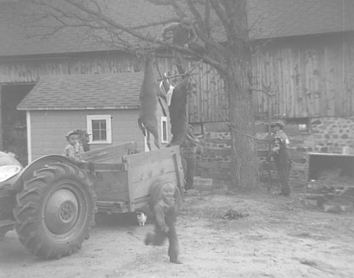 Albert Mohr Farm showing the tree where all the butchered animals were hung. Albert is standing to the right of the tree. These are deer. |