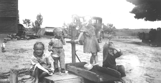 Dolores, Kenneth, Lois & Harvey, the children of Albert and Luella Mohr of Pine Valley, Clark Co., WI. This picture was taken about 1945 and shows the water pump on Clark Rd., across from Bert and Jenny Winter's place. Luella said the car in the background was likely a 1932-33 Chevrolet. |