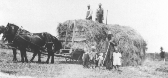 Haying on the Mohr farm in the summer of 1945 with their iron-wheeled wagon. Hay was "pitched" (thrown by pitch fork) onto the wagon. Atop the load is, Ernest and Albert Mohr and on the ground is Albert's children: Harvey, Lois & Kenneth to the left of Grandpa Chris Mohr and Albert's oldest daughter, Dolores is standing to his right. |