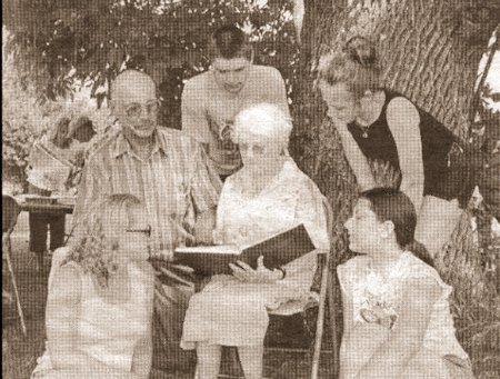 At the Sonheim family reunion last Sunday, Caroline Bohac (center), daughter of John and Elizabeth Sonheim, reminisces while reading stories from the book , put together by Robert Sonheim (left of Caroline), while great grandchildren of John and Elizabeth look on, including (front row, left to right) Amanda Vollmer, Tracey Warmington, (back row, left to right) Josiah Ludwick and Rebecca Ludwick. The family is in front of the ash tree planted by Caroline and her brother Phillip when they were youngsters. |