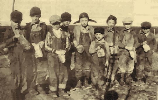 Dean Hubbard gave us this shot of a group of Breezy Hill School Boys examining their lunches on a cool day. The boys were identified as Galen Misfeldt, Dean Hubbard, Robert Soeller, Henry Fischer, Albert Huberty;, Roland Misfeldt, Henry Haas, Billy Krause, and Freddy Pagel.–from the Courier darkroom |