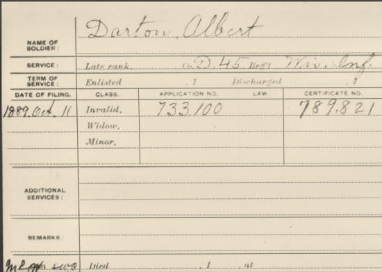 Albert Darton Co D 45th Wis Infantry Applied for pension 11 Oct 1899 Application # 733100 Certificate # 789821. Ken Wood.