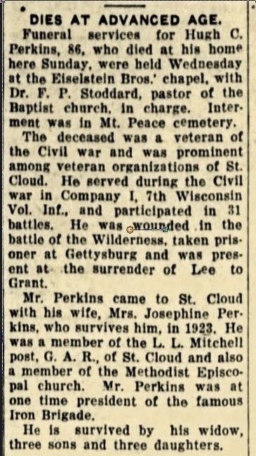 27 July 1844. He too served in the Civil War and his records are as follows: Hugh Perkins Regiment 7th WI Inf Co I Rank In PVT Rank Out PVT Alternate Name Hugh C/Perkins 7th Regiment, Wisconsin Infantry Organized at Madison, Wis., and mustered in September