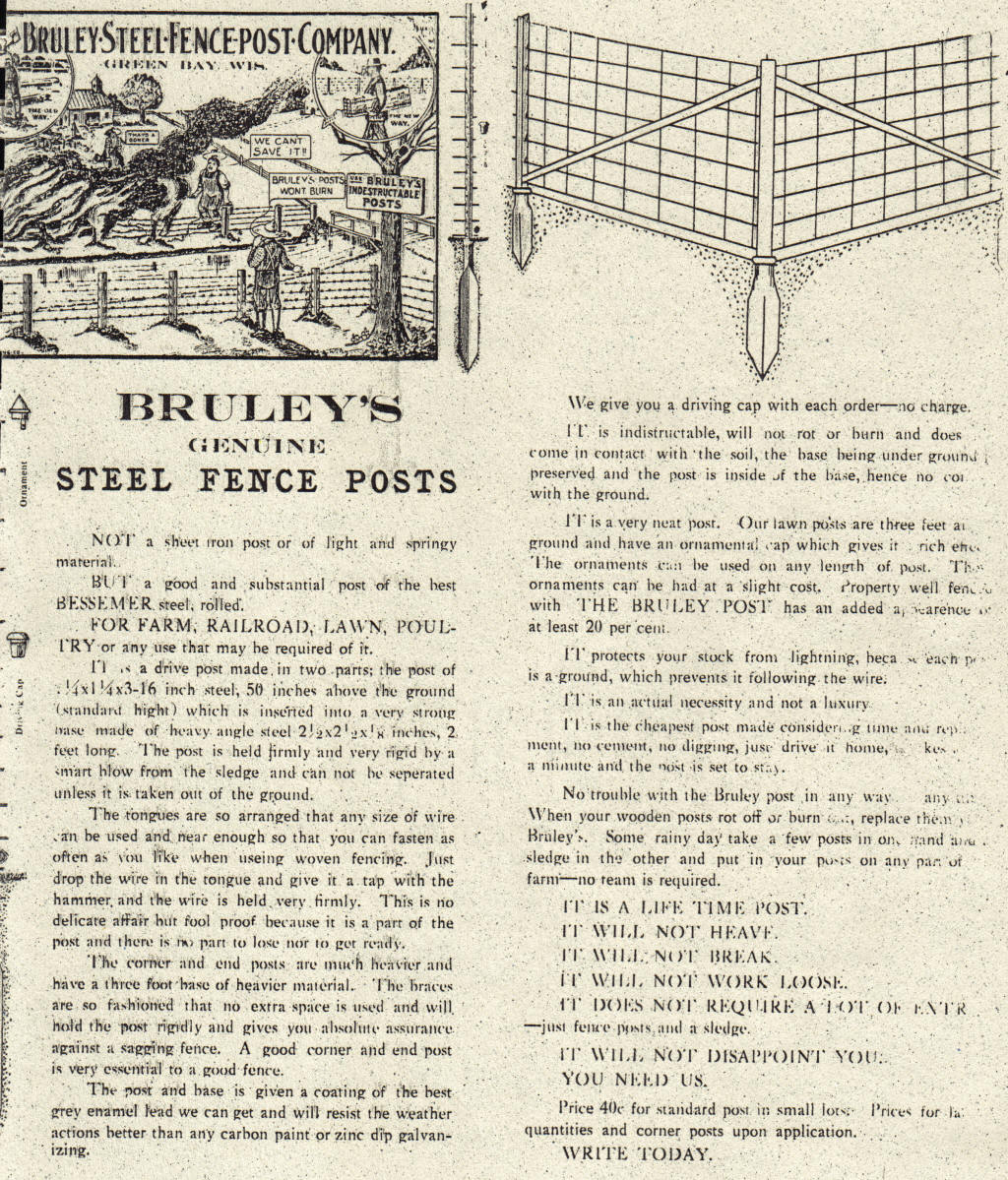 In 1905, Bruley invented a steel fence post, patenting it in that year. A large company went into the manufacturing of it. Bruley was its president and owned controlling interest. The factory was located in Milwaukee with business offices in Neillsville. C. L. Prescott assisted Bruley with the marketing in America as well as in Europe. (See this steel fence post information elsewhere in this Bruley history.)