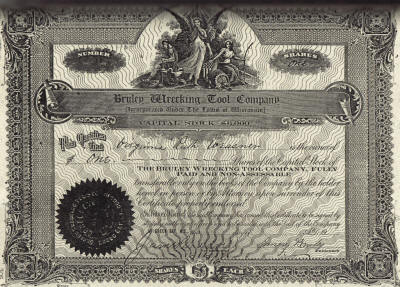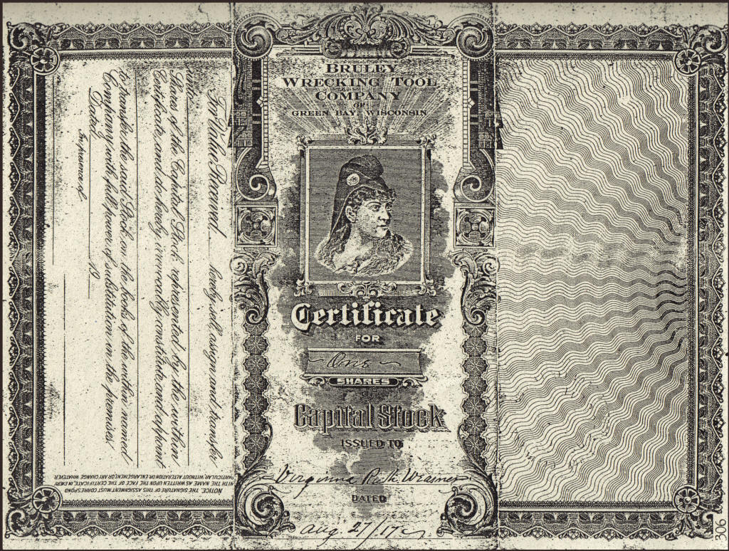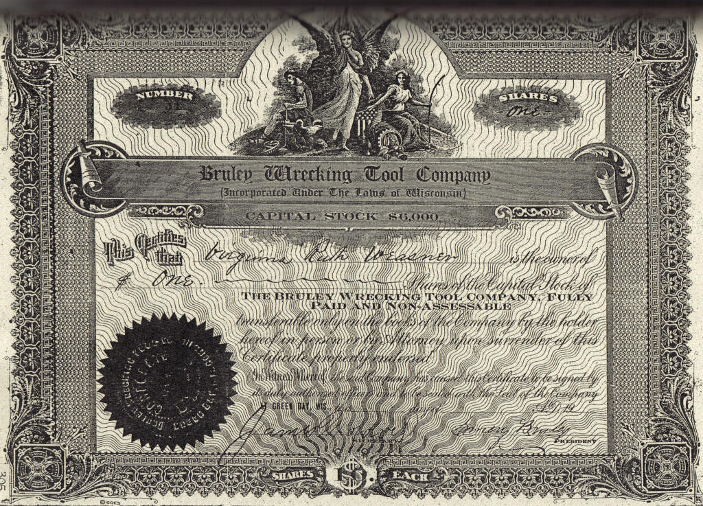 1917 Grandfather formed the Bruley Wrecking Tool Company of Green Bay. His office was in the Flatiron Building. Stock was issued for this company. Emery gave one share of stock to his first grandchild Virginia Ruth Wiesner. The certificate is on display at Tufts House in Neillsville.