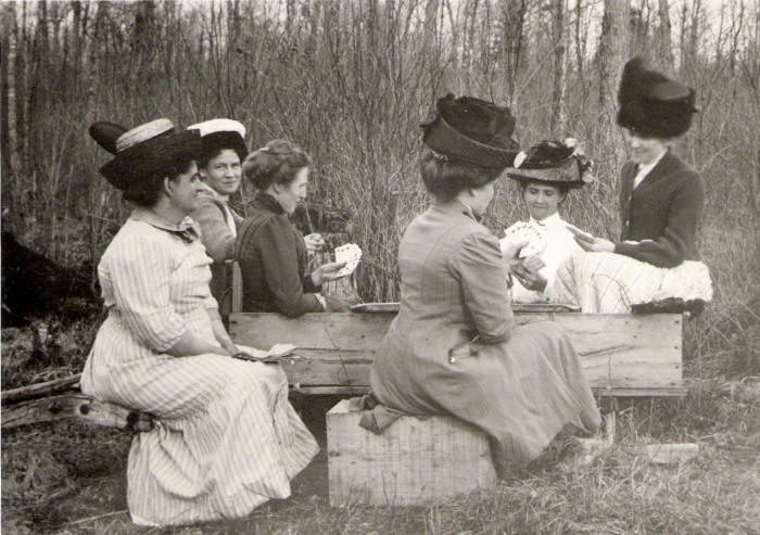 | We believe my maternal grandmother, Alice Worden Smith is pictured above on the left front. She was born in Thorp, Wisconsin, 1875 and married Edward Smith in 1893 at Greenwood, Wisconsin. Edward was born in 1870. Both of them were laid to rest in the Withee Riverside Cemetery. They had 9 Children, 5 boys and 4 girls. I don't know who the other ladies are in the photo, but they were having a great card game and I suspect the way they are dressed, they may have told their husbands they went shopping. I believe this picture was taken near Withee, Wisconsin since that is where my Smith family started out. |
