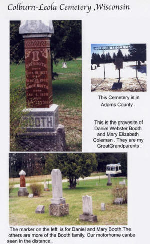 3. Daniel Webster Booth b. 18 Sept 1827 in Walworth, Wayne County, NY, married Mary Elizabeth Coleman 16 June 1845, and he died 13 Nov. 1902. Mary Elizabeth (Coleman) Booth b 4 Feb. 1829 Mausauro, NY; d. 25 April 1908 Plainfield, Waushara Co, WI.