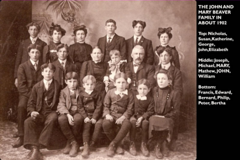 The children of John and Mary Beaver were: Katie, b. 1874; Susan b. 25 Nov. 1875; Mary, b. 1873; George, b. 23 Feb. 1877; John, b. Oct. 1879; Elizabeth Frances, b. 23 Mar. 1881; Joseph, b. 1882; Michael, b. Jul. 1884; Nicholas, b. Jan. 1886; William Andrew, b. 2 Apr. 1887 - Aug. 20, 1967); Frank, b. Oct. 1888; Bertha Anna, b. 25 Dec., 1889; Ada, b. Jun. 1892; Philip, b. 8 May 1894 - d. 2 Dec. 1942; Peter, b. 23 Nov. 1895; Bernard John, b. 23 July 1897 - d. 8 Jan 1990; and Matthew, b. 28 Sep. 1898 - d. 23 Dec. 1983.