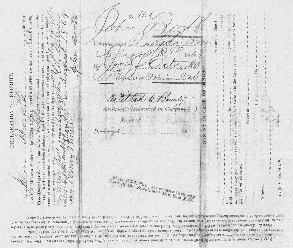 He fought as a private in the Great Civil War with Co. H, 11th Minnesota Infantry. He enlisted August 29, 1864 and was discharged June 26, 1865. His next of kin was registered as Alta B. Hartson (granddaughter) of 88 Delano St., San Francisco, California. The information for his Veteran's Grave Registration was provided by H. H. Hartson and John Arends of Greenwood, Clark Co., Wisconsin. He is buried in grave number 2, lot 4 of the "B" section in the Greenwood City Cemetery.