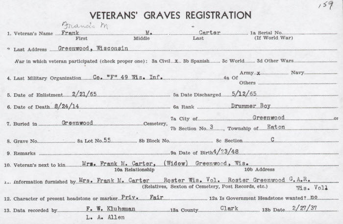the 49th Wisconsin Infantry on February 21, 1865, serving as a "Drummer Boy"