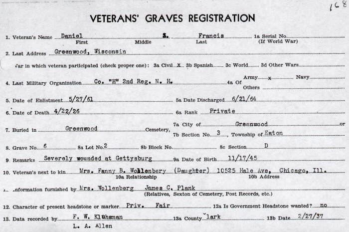 Francis, Daniel head m w 75 m New Hampshire Massachusetts New Hampshire Francis, Margaret wife f w 65 m New York Ireland Scotland Francis, Leona M. grand-daughter f w 16 s Wisconsin Wisconsin Wisconsin