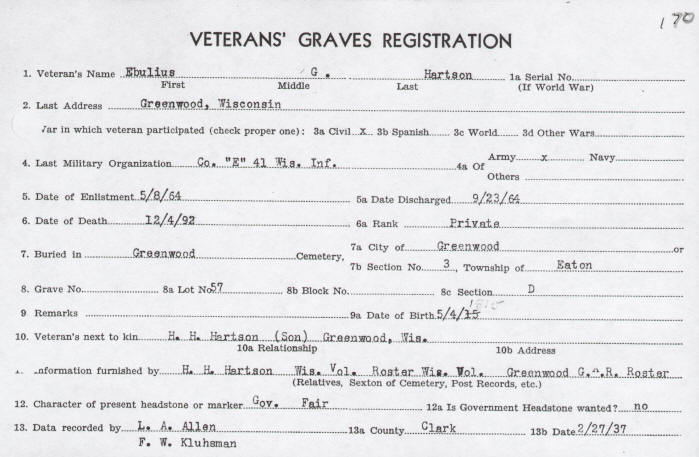 Ebulius G. Hartson was born May 4, 1815. He enlisted with Co. "E" of the 41st Regiment of the Wisconsin Infantry on May 8, 1864 serving as a Private and was discharged September 23, 1864. He died December 4, 1892 and is buried in the Greenwood, Wisconsin City Cemetery. His son, H. H. Hartson, of Greenwood, Wisconsin was listed as his next of kin on his grave registration. |