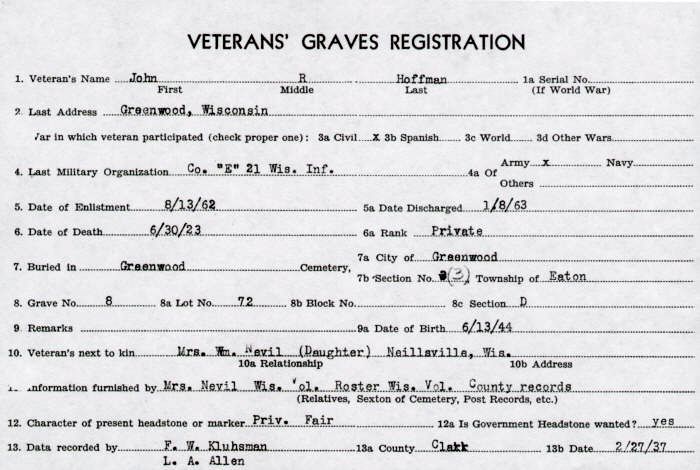 in the Greenwood, Wisconsin City Cemetery. His daughter, Mrs. William