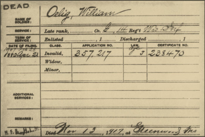 William Oelig was born in 1840. He enlisted with Co. "G" in the 14th Regiment of the Wisconsin Infantry on November 18, 1863 serving as a Private and was discharged October 9, 1965.