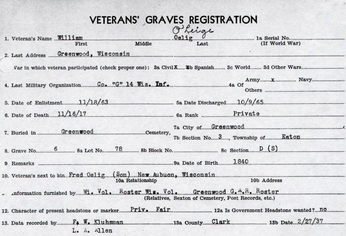 William died November 16, 1917 and is buried in the Greenwood, Wisconsin City Cemetery. His son, Fred Oelig of New Auburn, Wisconsin was listed as his next of kin on his grave registration.