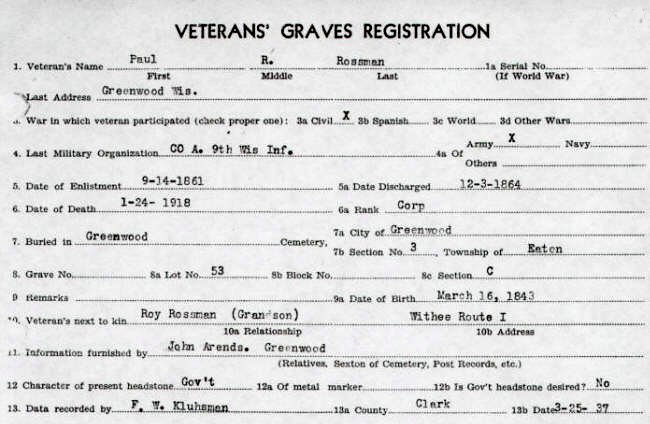 His grandson, Roy Rossman of Withee, Wisconsin was listed as his next of kin