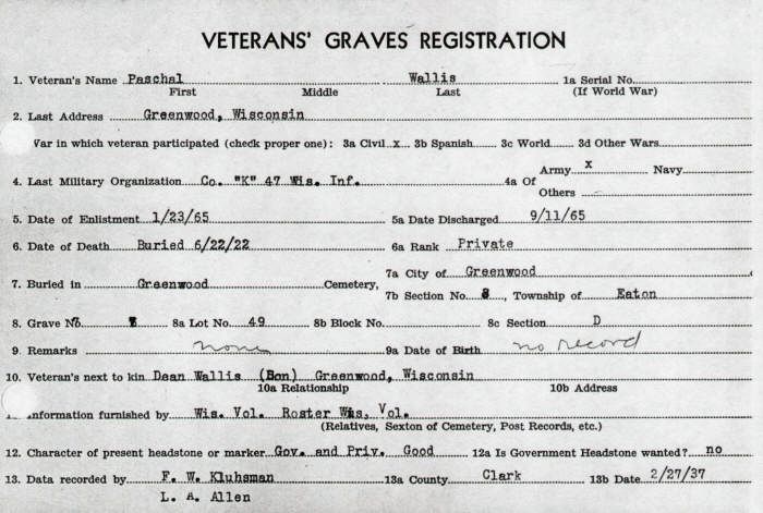Cemetery. His son, Dean Wallis of Greenwood, Wisconsin was listed as