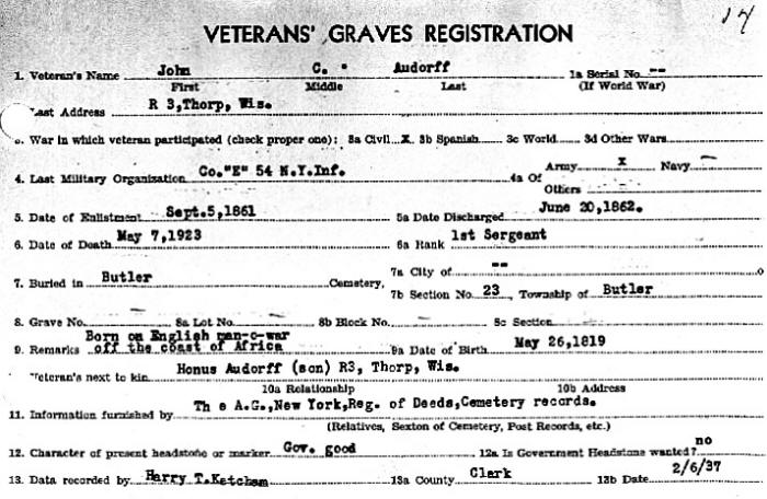 Karl Audorff was born aboard an English Man-O-War at sea on May 26, 1819. His
