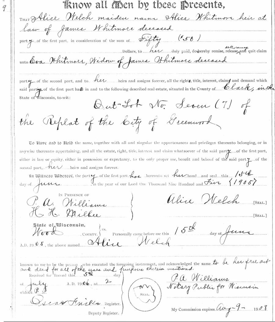 Alice, nee Whitmore, Welch to Eva Whitmore, widow of JAMES, 15 June 1905 City of