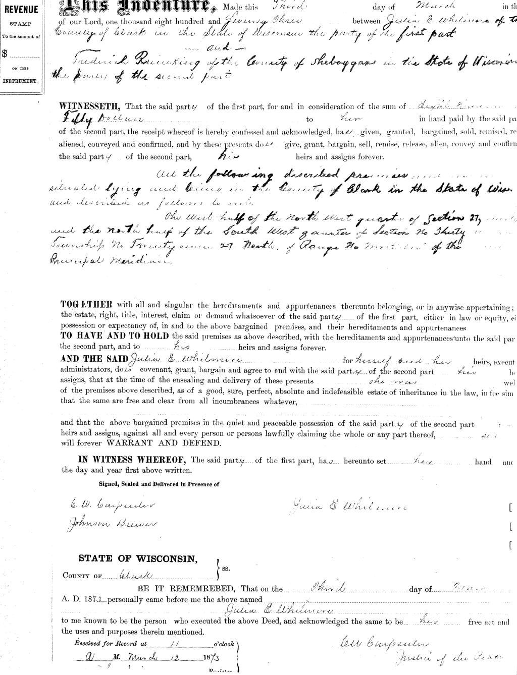 JULIA Whitmore to Fred Reinking 3 Mar 1873, twnshp 27, sec 27, 30. [This is