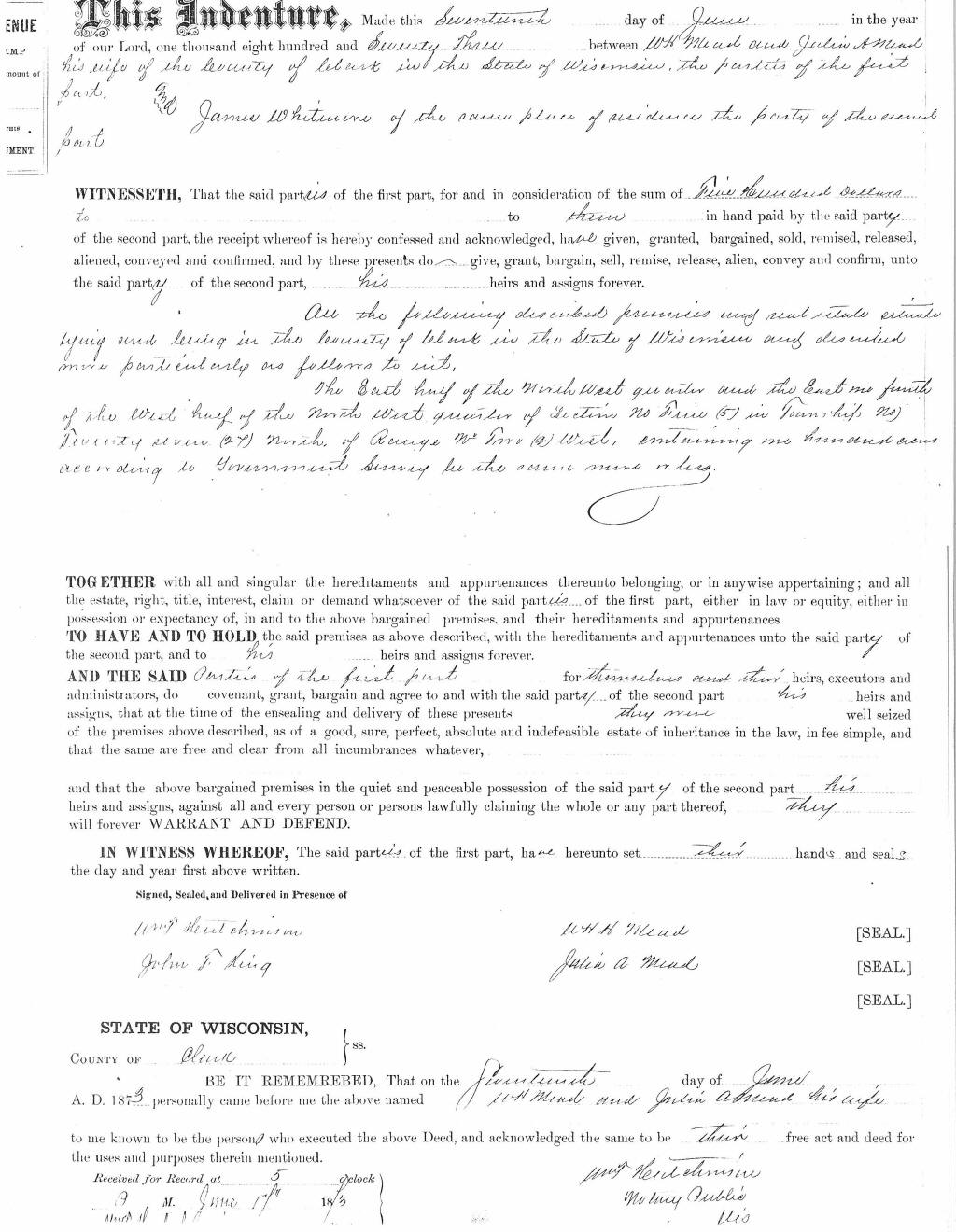 Wlm and Julia Mead to JAMES Whitmore 17 June 1873, twnshp 27 sec 5 [JAMES was