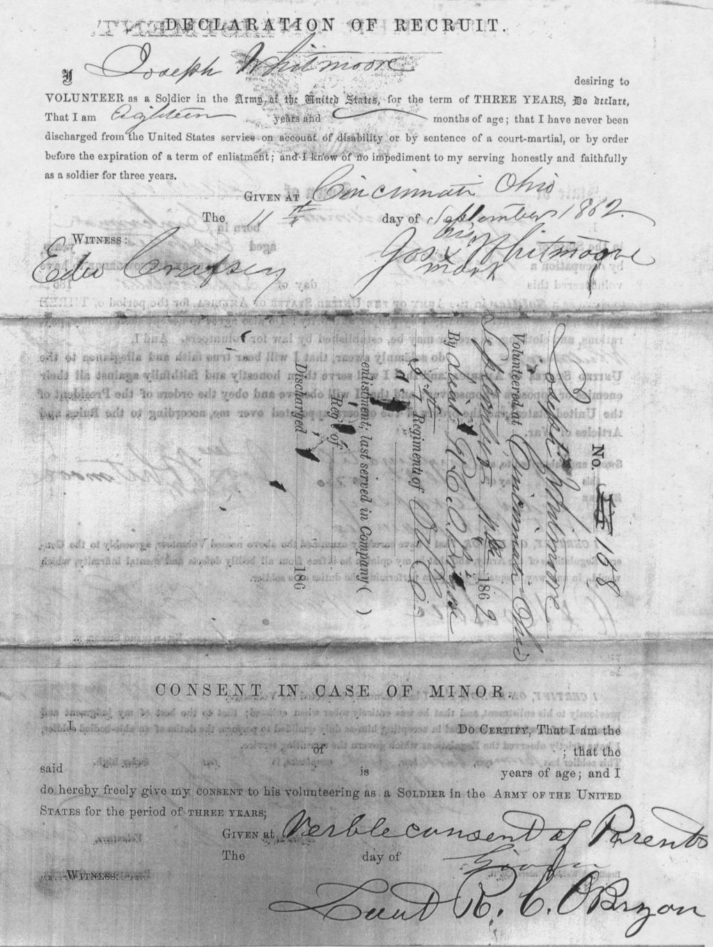 Cincinnati and was sworn in by Edward Crabsey and assigned to Company L of the