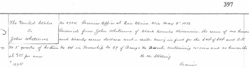 US to JOHN Whitmore 9 May 1872, sec 34, twnshp 27. [JOHN and JULIA nee Lambert