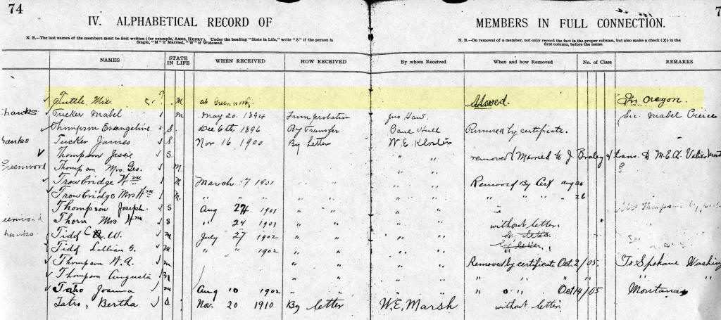Methodist Church Records, Caroline Tuttle moved to Oregon about 1893 or