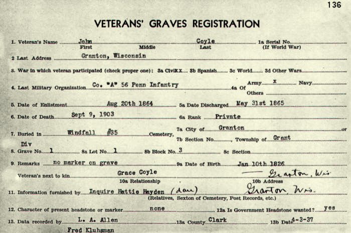 John Coyle/Coil died September 9, 1903