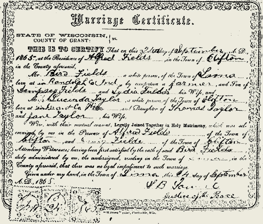 and Lucinda where married in Grant County, Wisconsin 24 Sept. 1865;