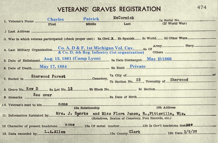 Charles Patrick McCormick did enlist with Michigan's 1st Cavalry in the