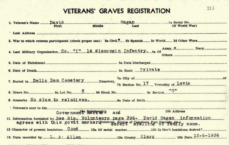 David Hagen/Hagan is buried in Section G, Lot 2 of the Dell's Dam Cemetery in Levis Township. He fought as a private with Company I, 14th Wisconsin Infantry. He enlisted January 3, 1862 and was discharged May 20, 1862, with a disability after just over four months of service.