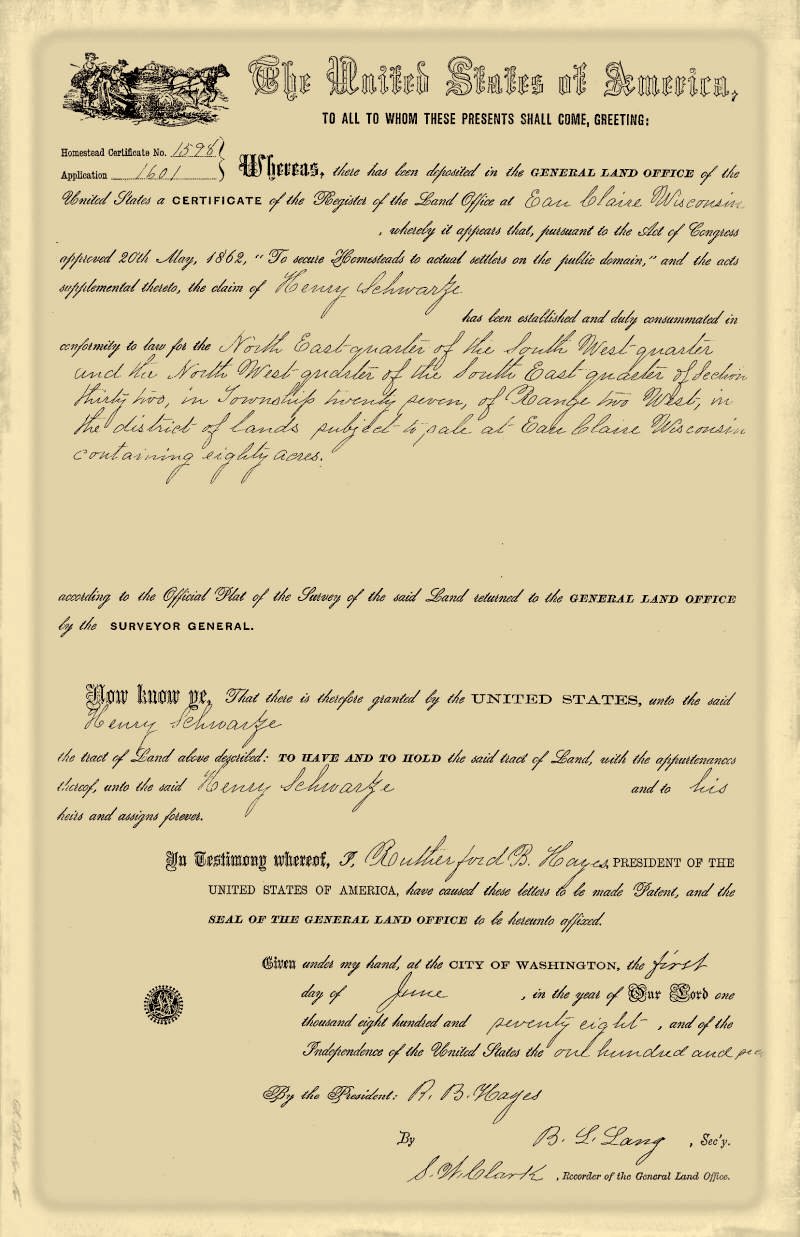 purchased by Henry Schwarze in Warner Twp., Clark County, Wisconsin.