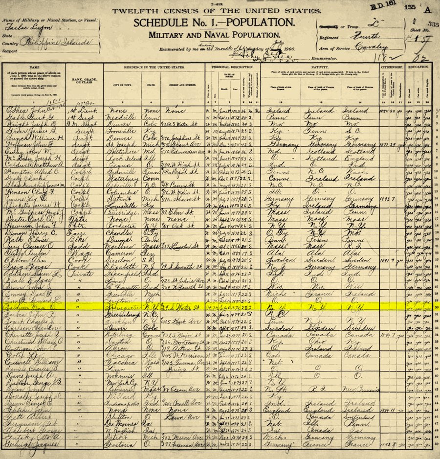 Census, 1900, ED 161 Pasay Calvary Barracks Field Staff & Band 4th Calvary,