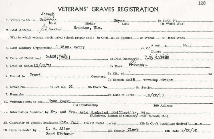 Joseph Noyes was a resident of Granton, Grant Township, Clark Co., Wisconsin.