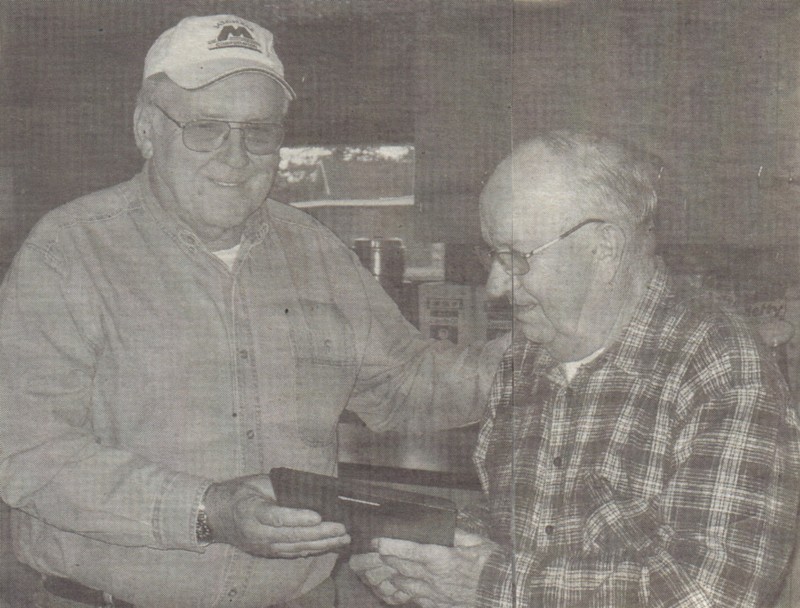 Upon his retirement after 54 years as the treasurer of the Town of Foster, Ray Durst (r) accepts a congratulatory plaque from former town chairman, Dave Poehnlein. The plaque was presented at the annual meeting in April. Contributed photo