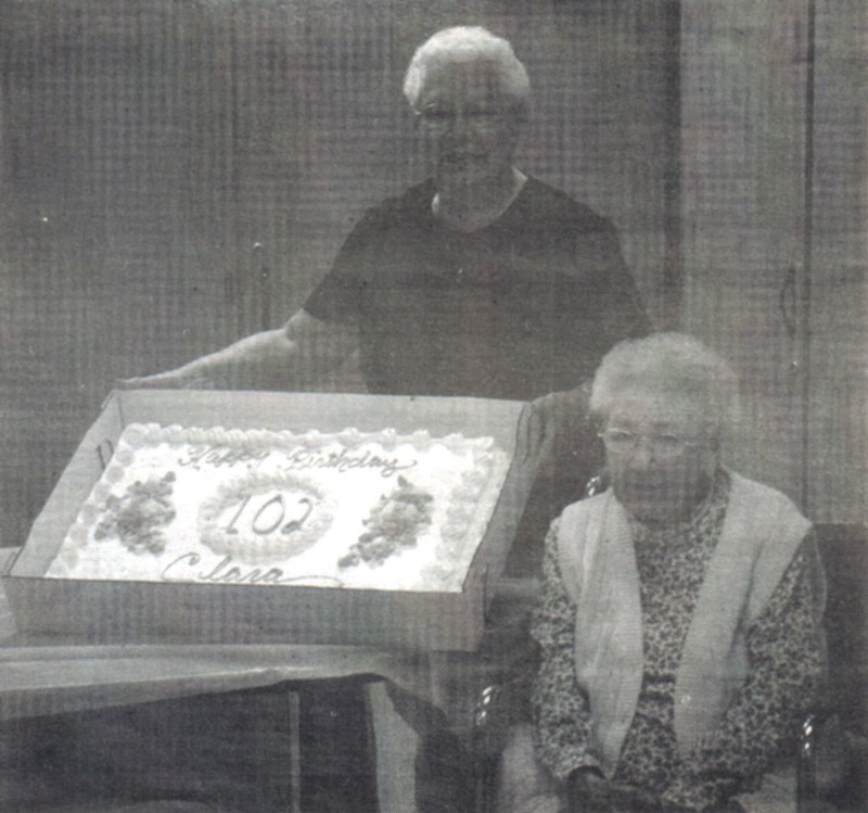 Clara Hemp (seated) of Neillsville poses with her daughter, Vivian Bohnsack, who’s holding a birthday cake to celebrate Hemp’s birthday. Hemp, who turned 102 Sunday, Sept. 6, celebrated with friends and family Thursday, Sept. 10, at the Neillsville Memorial Medical Center Health and Rehabilitation Center.